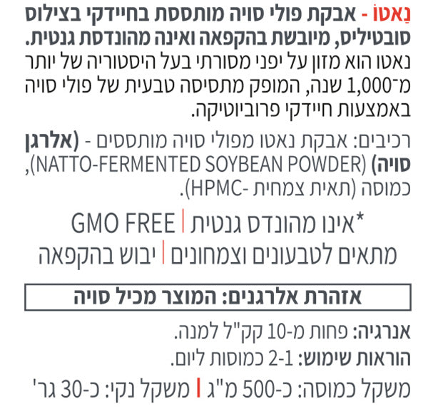 נאטו הוא מזון על יפני מסורתי המבוסס על פולי סויה מותססים בתהליך טבעי עם חיידקי פרוביוטיקה. התסיסה יוצרת נאטוקינאז – אנזים פעיל התומך בזרימת דם תקינה ובאיזון טבעי של מערכת הקרישה. שילוב ייחודי של אנזימים, פרוביוטיקה ונוגדי חמצון, המיוצר בייבוש בהקפאה לשמירה על איכות ופעילות מרבית.